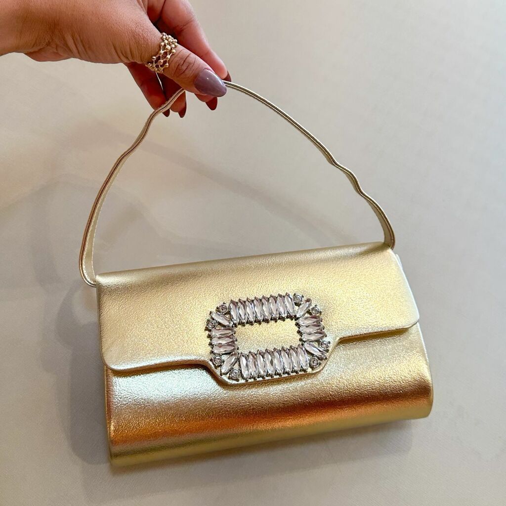 A bolsa perfeita para festas! Vem com duas alças: uma curta de mão e outra de ombro em corrente. O fecho com pedras que lembram diamantes dá um toque de brilho e elegância para seus looks.